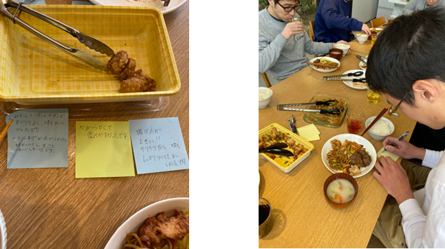 各自、自宅で作った料理を少しずつ持ち寄りました。 「口に合うかな…」と最初は少しドキドキ。でも、実食しながら感想を付箋に書いて贈り合うと、会場は一気に笑顔に包まれました✨